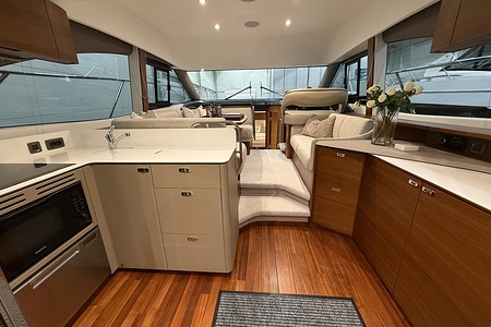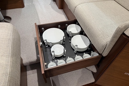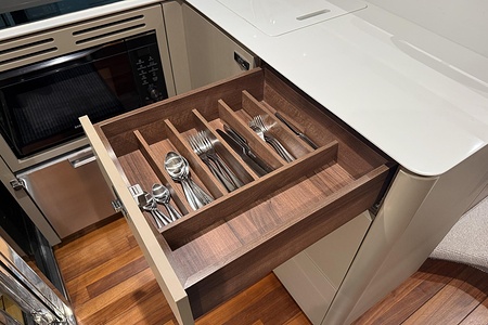 Galley worktops including starboard sideboard are Sylmar White Solid Surface (satin finish) as standard