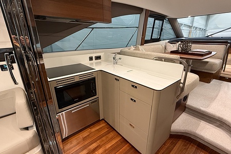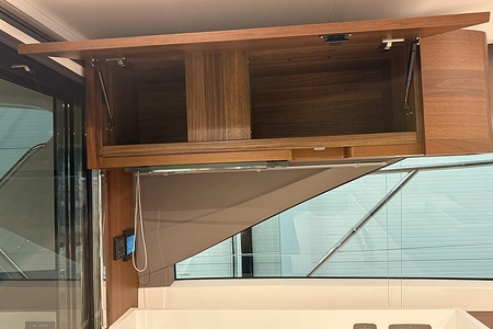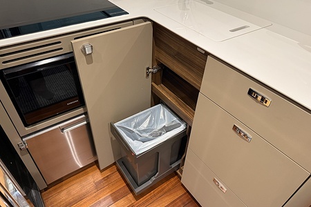 Optional flybridge wetbar incorporating sink, electric griddle/BBQ, waste bin and top loading coolbox