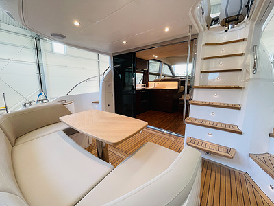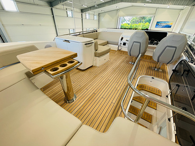 Teak (6mm) on bathing platform, cockpit and steps to flybridge